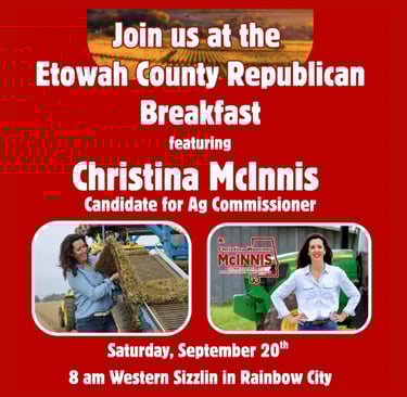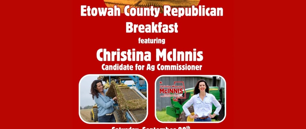 Etowah County Republicans will meet for Breakfast at 8:00 AM on Saturday, September 20, 2025 at the Western Sizzlin, 209 West Grand Ave, Rainbow City, AL 35906. The featured speaker will be Christina McInnis, candidate for Alabama Commissioner of Agriculture and Industry. Baldwin County native McInnis is an 5th-generation Alabama farmer. She was raised in the Woerner family, one of the State's most recognized agricultural names, and has built a career focused on innovation in farming and soil health. As founder of AgriTech Corp and creator of SoilKit, she has worked to make science-based soil analysis accessible for farmers, landowners, and homeowners alike. McInnis is currently facing two other opponents, Cory L. Hill and Jack Williams, in the Republican primary on May 19, 2026. The event is free and open to the public, who are encouraged to attend. Etowah County Republicans are encouraged to bring a friend with them.